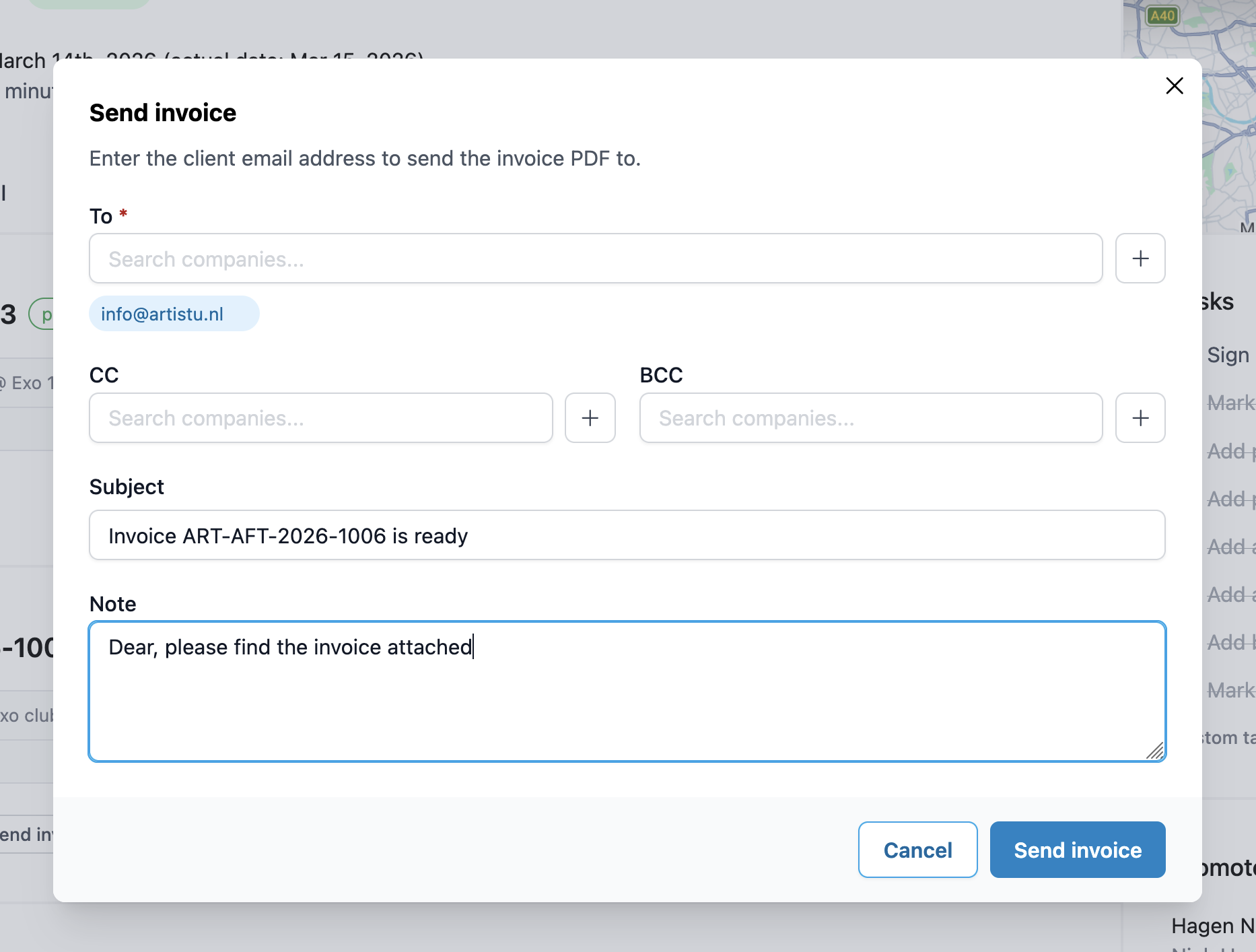 Eine Rechnung aus deiner Buchung in zwei Klicks erstellen. Direkt per E-Mail an den Kunden senden oder via Peppol-E-Invoicing für EU-Agenturen. Die Rechnung landet im Buchhaltungssystem deines Kunden, ohne dass jemand etwas drucken oder anhängen muss.