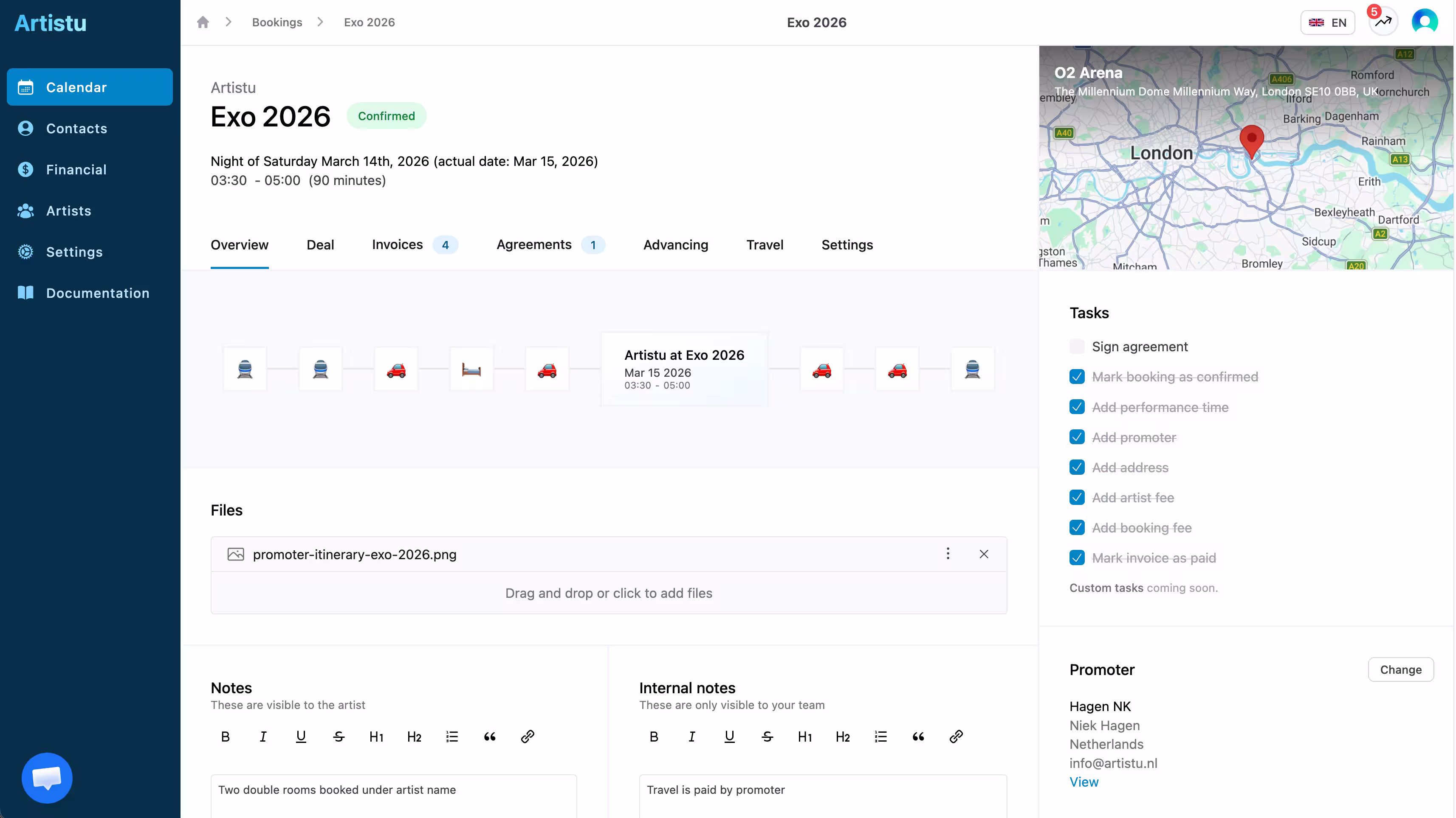 Du machst die Deals. Artistu erledigt den Rest. Verfolge jede Show von der ersten Anfrage bis zur bezahlten Rechnung, ohne zwischen Tabellen, E-Mails und separaten Tools zu wechseln.