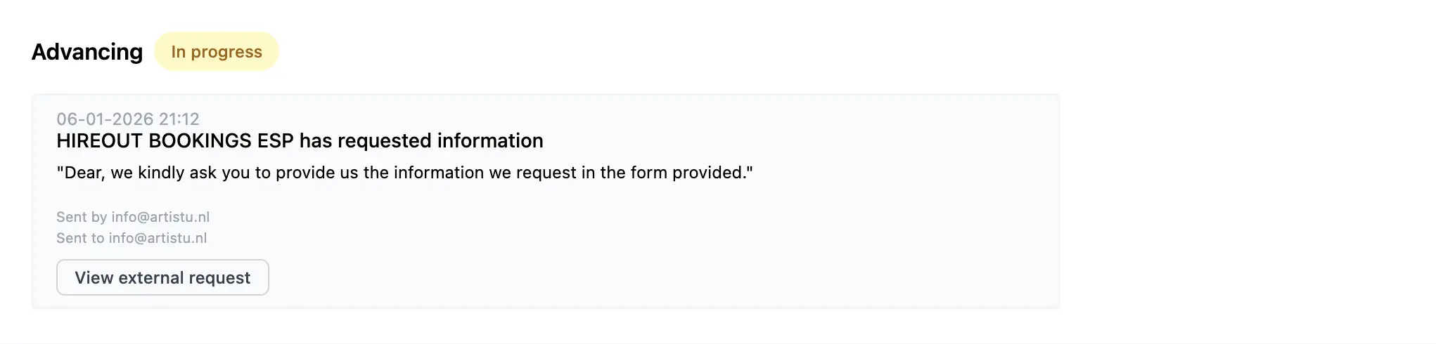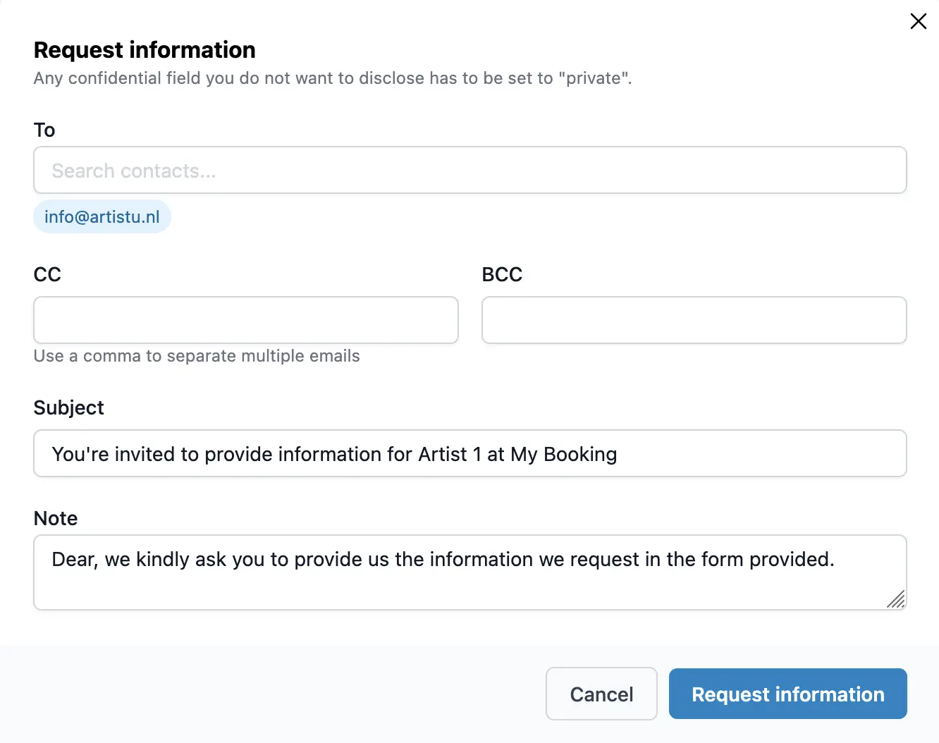 Sie können Informationen anfordern, indem Sie eine benutzerdefinierte E-Mail direkt an die bereits in der Buchung gespeicherten Kontakte senden.
