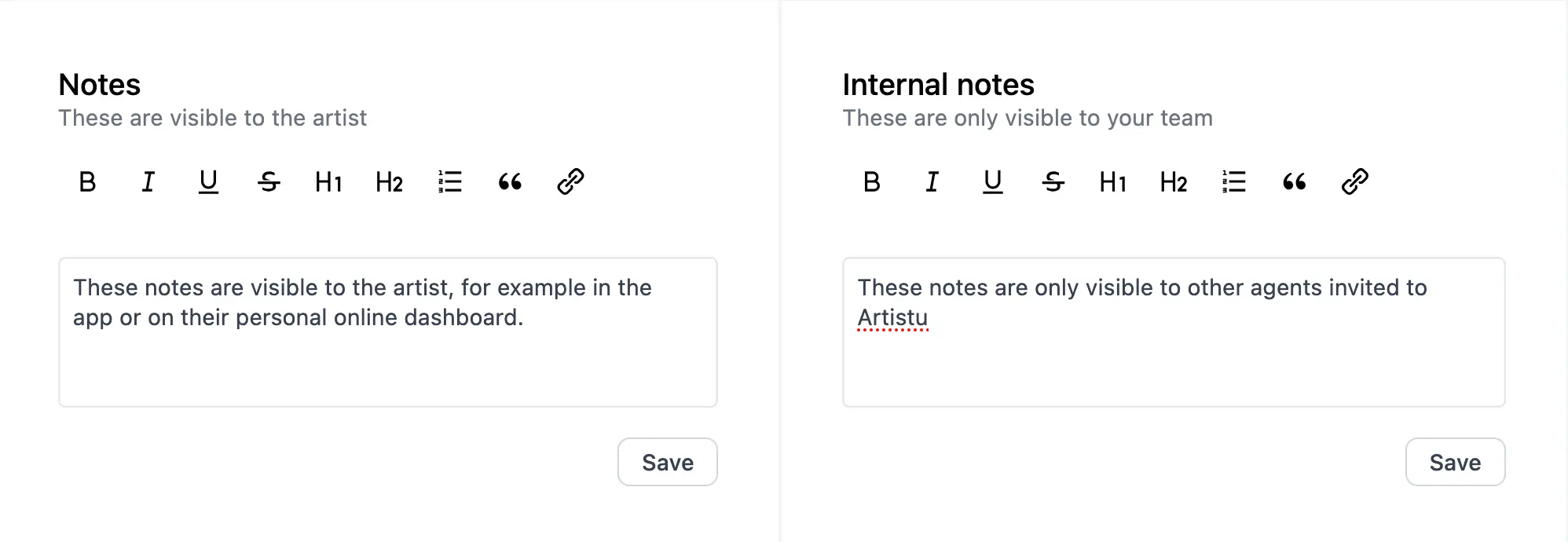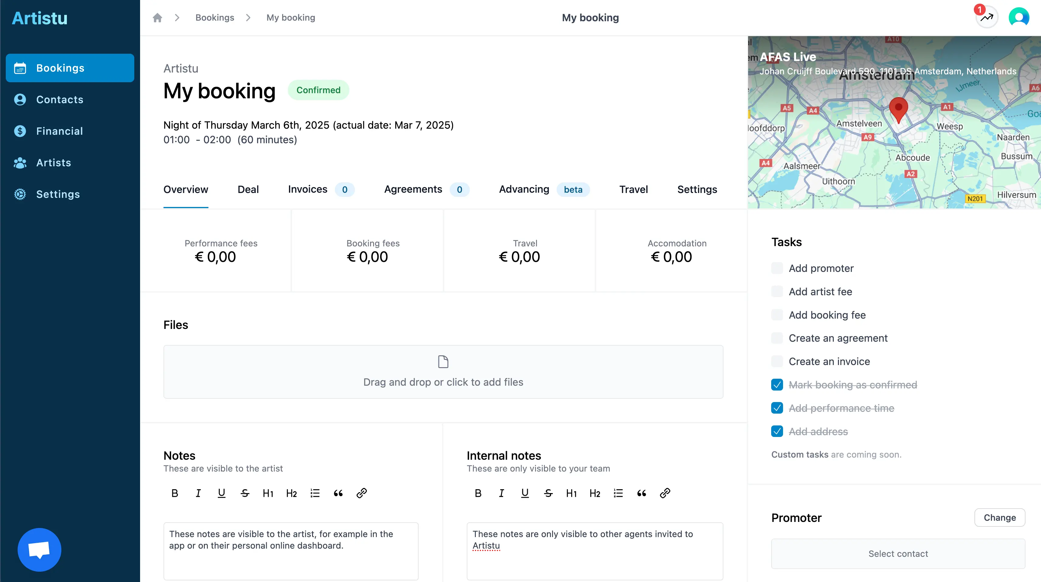 Artistu ermöglicht es Ihnen auch, interne Notizen zur Buchung hinzuzufügen. Diese Notizen sind nur für Sie und Ihr Team sichtbar.