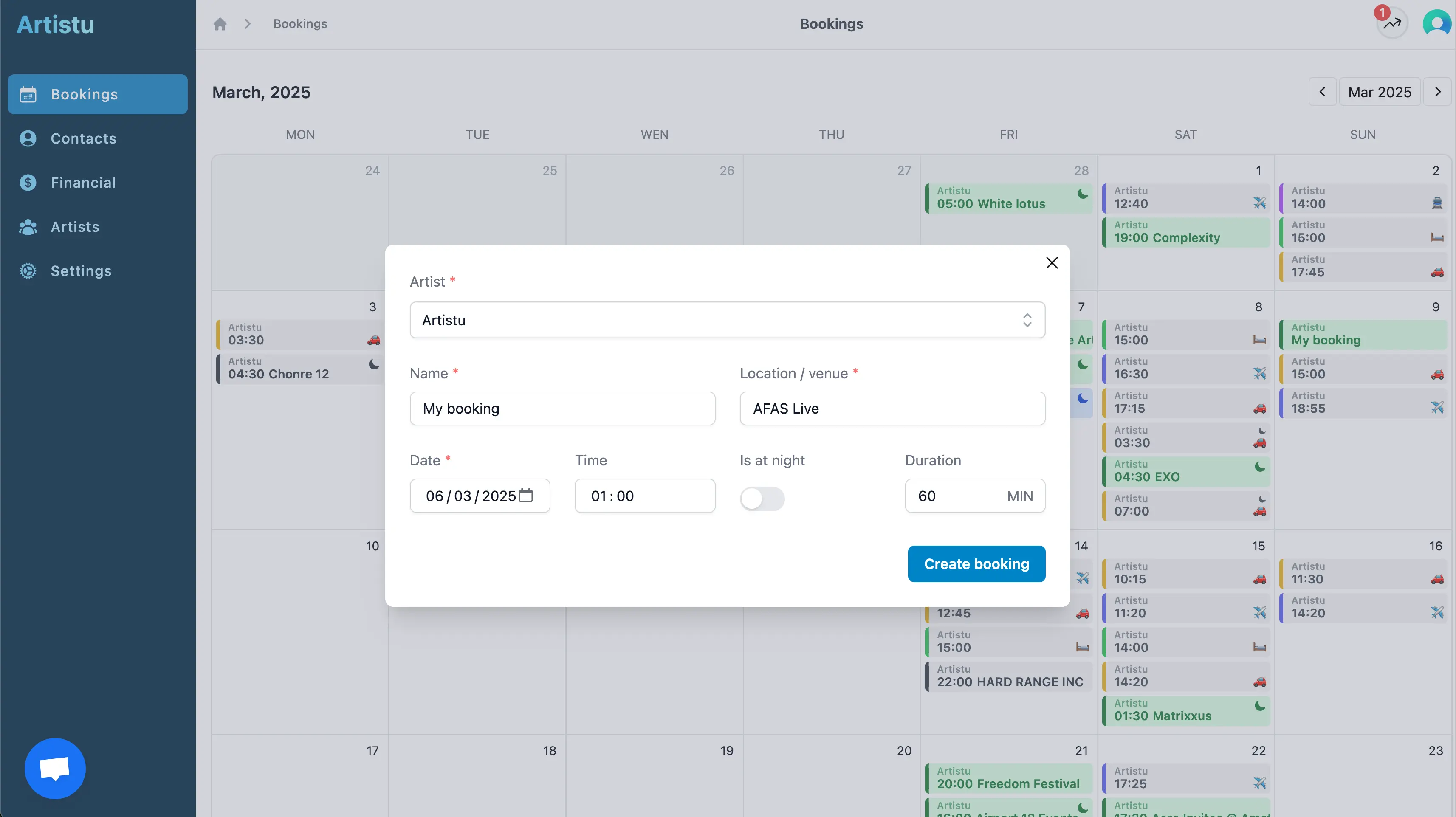Ein Beispiel hierfür ist das Einstellen des Datums auf den 3. März um 02:00 Uhr und die Auswahl von "at night" als Buchungszeit. Artistu erstellt dann eine Buchung für den 4. März um 02:00 Uhr, die nächste Nacht.