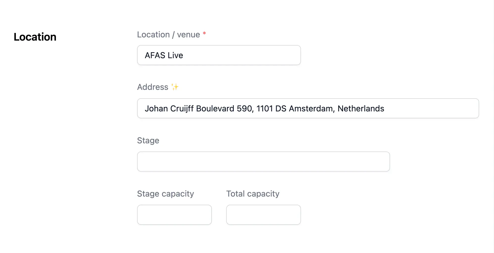 Nachdem Sie die Buchung erstellt haben und zum Tab "Einstellungen" gewechselt sind, wird empfohlen, notwendige Informationen über den Auftritt wie den Veranstaltungsort, die Bühne, die Kapazität und die Adresse anzugeben.